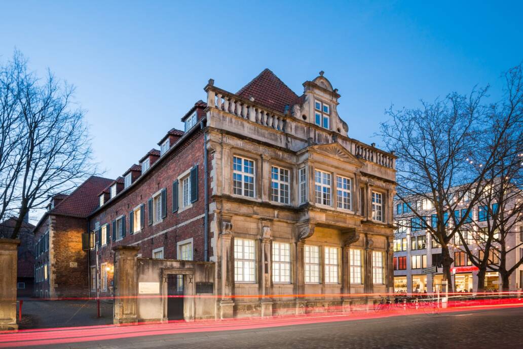 From the main train station, the walk is about 5 minutes. From the main entrance of the train station, cross the pedestrian crossing into Windthorststraße (initially pedestrian zone) in the direction of the city center. After you have crossed another pedestrian light, go over the crosswalk and then diagonally left into the continuation of Windhorststraße (pedestrian zone). Then cross Ludgeristraße and after a few meters you are in front of Heereman'schen Hof (diagonally left), Königsstraße 47.